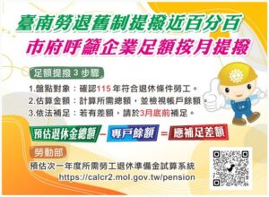 【外勞社記者楊孝慈2026年2月4日報導】《勞動基準法》第56條第2項規定,適用舊制退休金制度之事業單位,對於當年度符合退休條件的勞工,應於每年3月底前補足退休準備金差額,確保勞工退休權益不受影響。台南市政府勞工局預計2月底再次發文提醒事業單位注意足額提撥期限,並安排專人提供直接輔導與諮詢服務,協助企業正確完成退休準備金提撥作業。